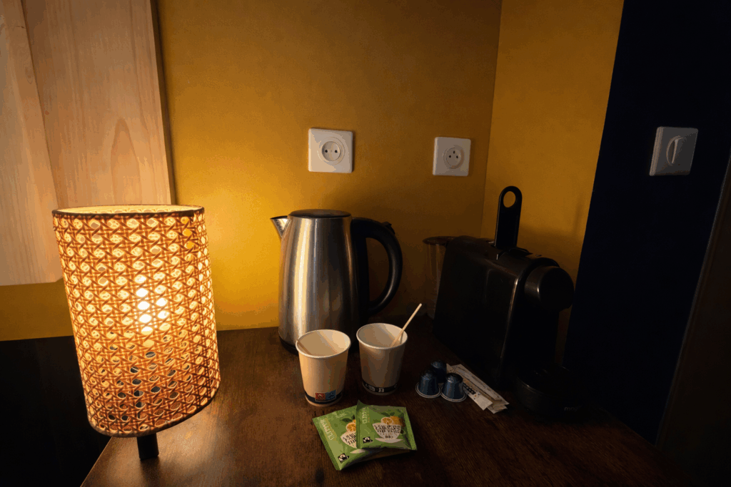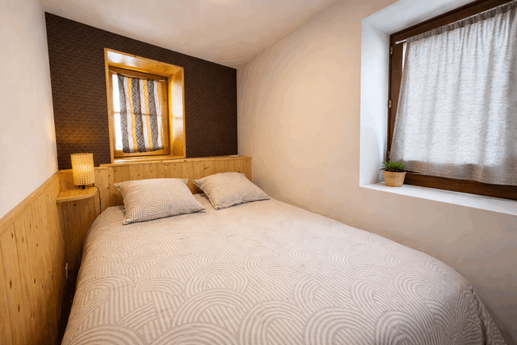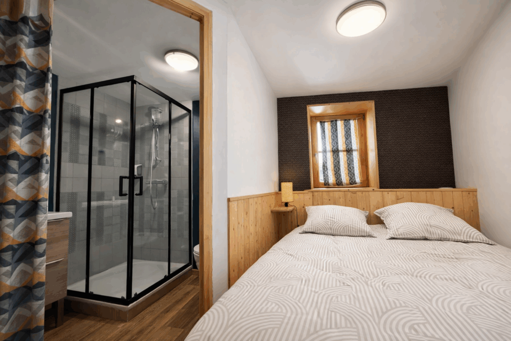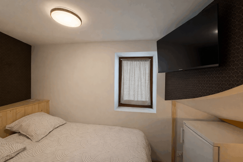 Cette chambre modeste dotée d’un lit double 140 x 190 peut idéalement accueillir 1 ou 2 personnes. Elle dispose d’une salle de bain avec douche, lavabo et WC, sèche serviette, d’un frigo/congélateur, d’un micro-onde, d’une bouilloire ainsi qu’une machine à expresso. Enfin pour votre plus grand confort une télévision avec thé, tisane et café sont à votre disposition. Le wifi est gratuit pour toute la durée de votre séjour.